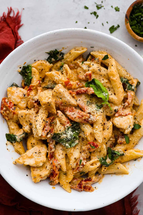 Tender organic grilled chicken breast and thigh, paired for the perfect balance of lean protein and juicy flavor, served over perfectly cooked organic penne pasta. Everything is coated in a velvety tomato cream sauce made with sun-dried tomatoes, roasted organic tomatoes, wilted spinach, and freshly grated parmesan.