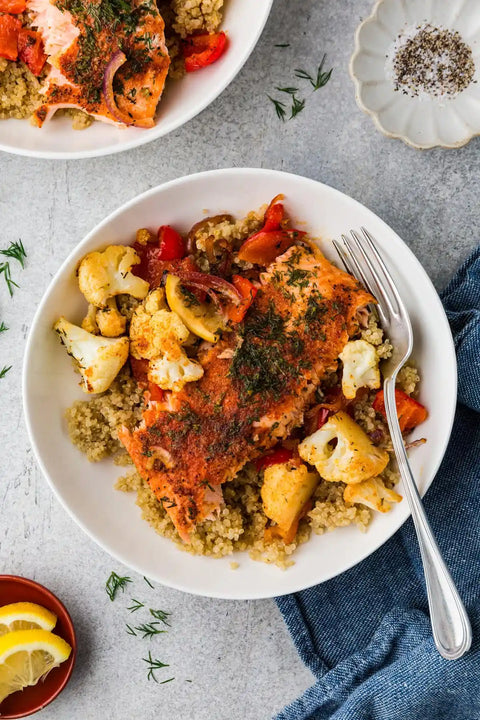 Perfectly blackened wild-caught salmon with a smoky, savory crust, served over fluffy organic quinoa cooked in our garlic herb bone broth. Finished with tender organic red bell pepper and garlic parmesan cauliflower for depth, richness, and comfort.